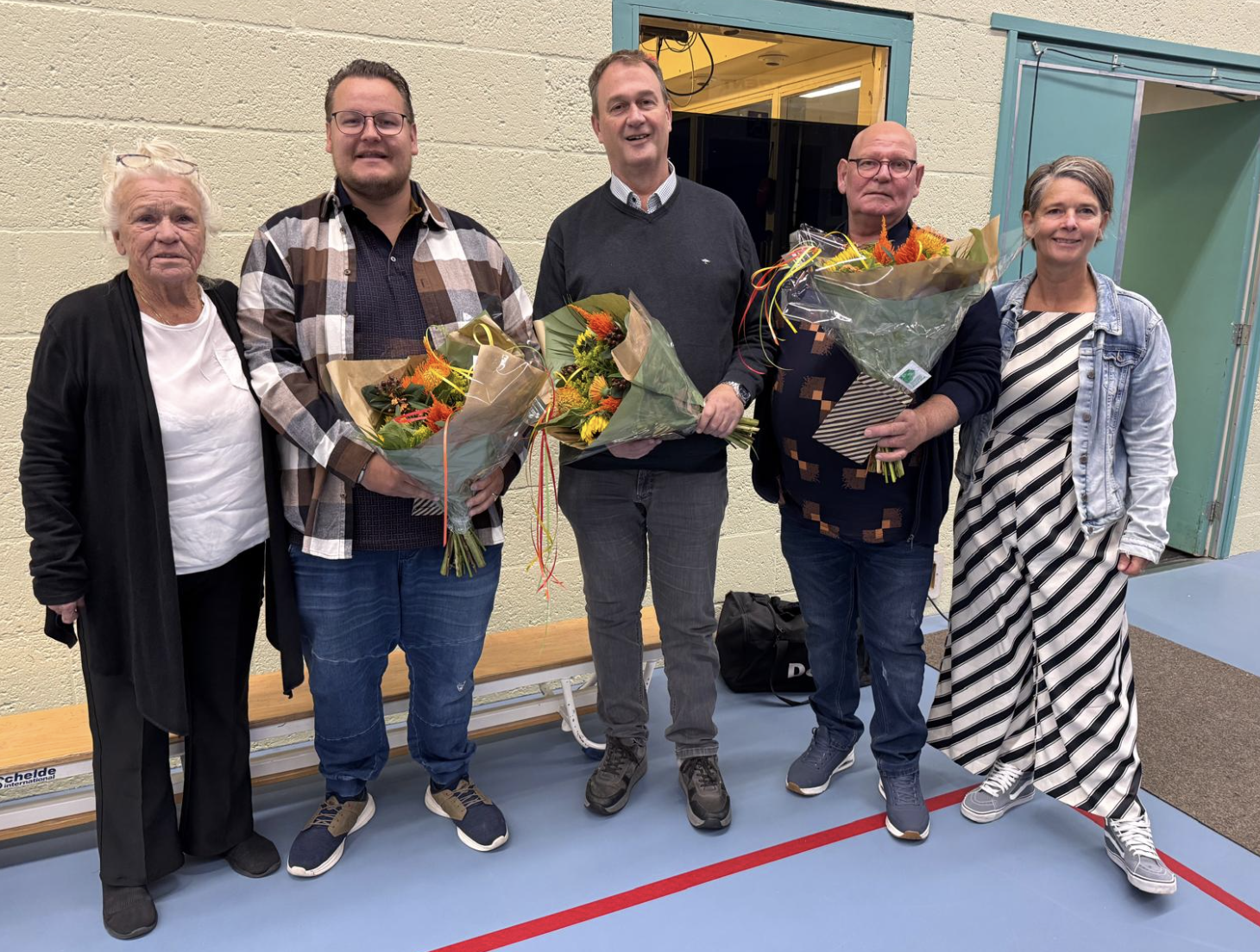 Er werd ook afscheid genomen van drie DWOC leden die afgelopen seizoen zijn gestopt. Uit handen Helen Nuijens (districtssecretaris) ontvingen Toon Minneboo, Vincent Minneboo en Marcel Keizers een bloemetje en cadeaubon voor hun inzet. Rieka Bakker (links) blijft als DWOC lid nog wel aan en zal nog te zien blijven op onze districtsevenementen!