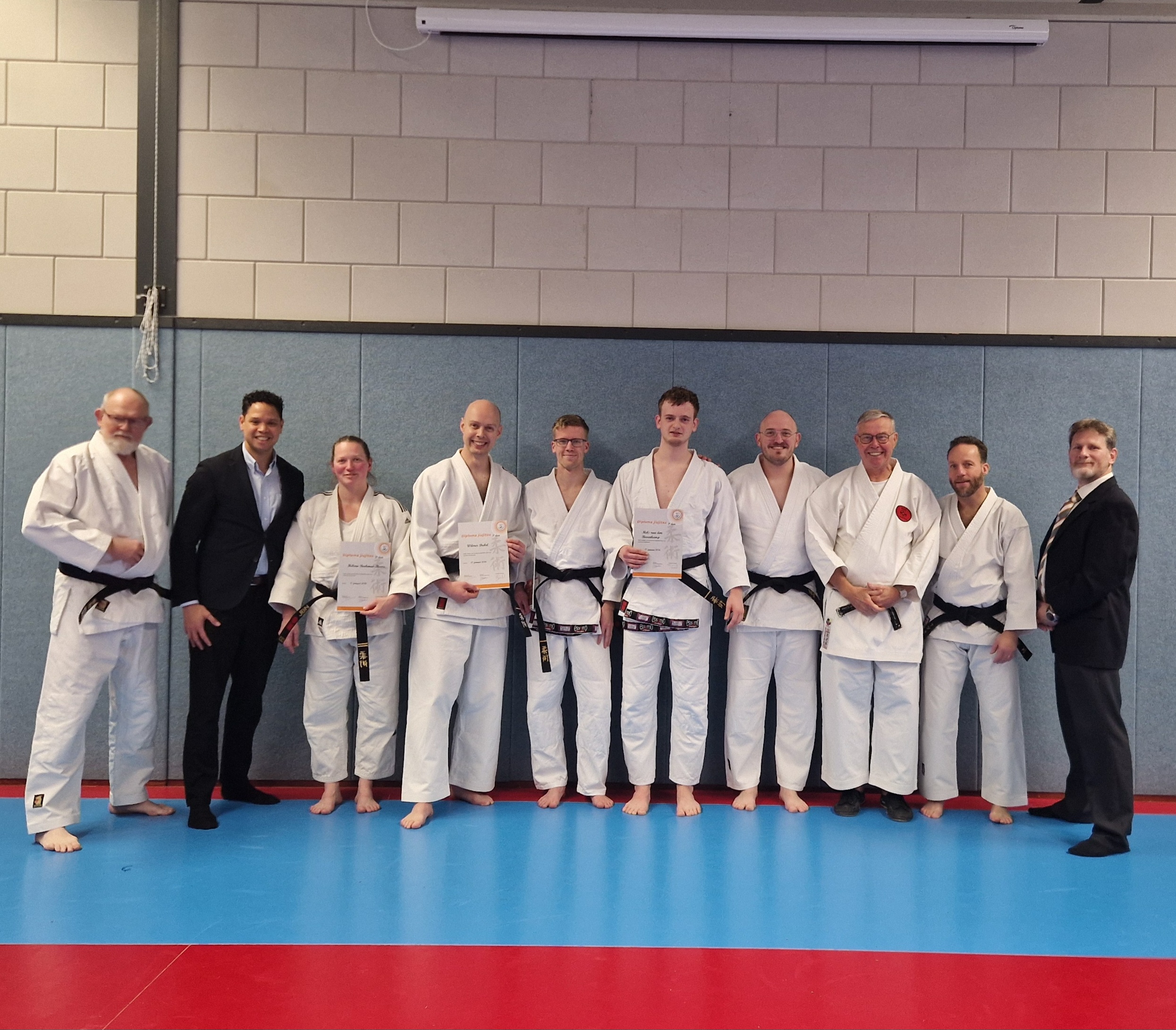 Bij de onlangs gehouden Jiujitsu dan-examens in ons district zijn de volgende kandidaten geslaagd; (op foto van links naar rechts) Voorzitter Alfred Maatman nam