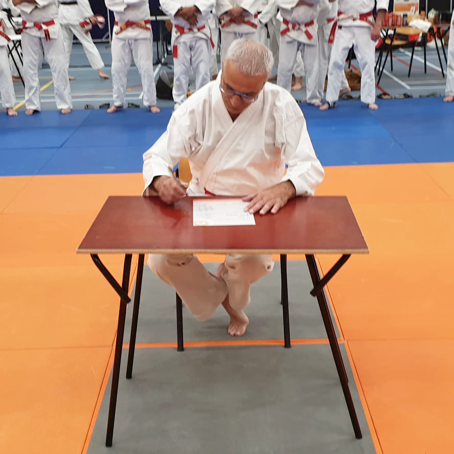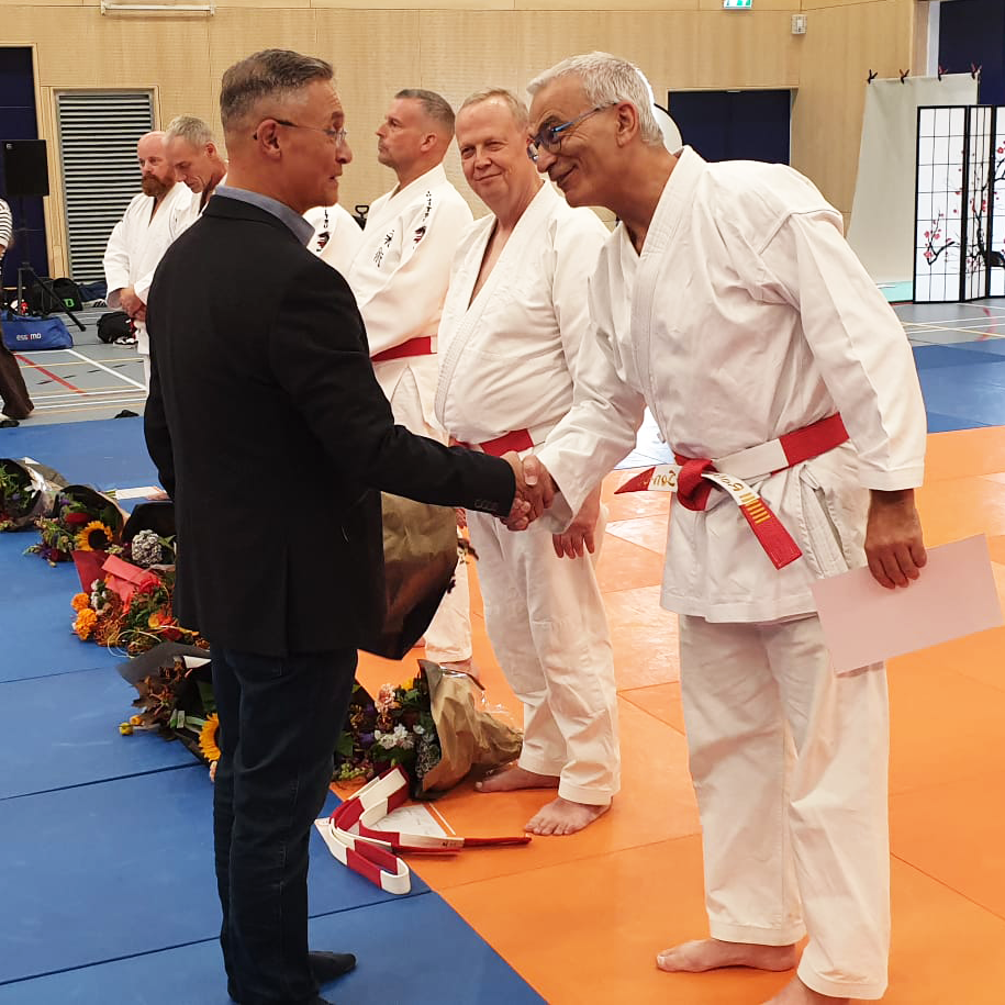 De 7e dan jiujitsu werd omgeknoopt door Wim van Vorstenbos (9e dan jiujitsu en oud voorzitter van de JBN Nationale Graden Commissie Jiujitsu).